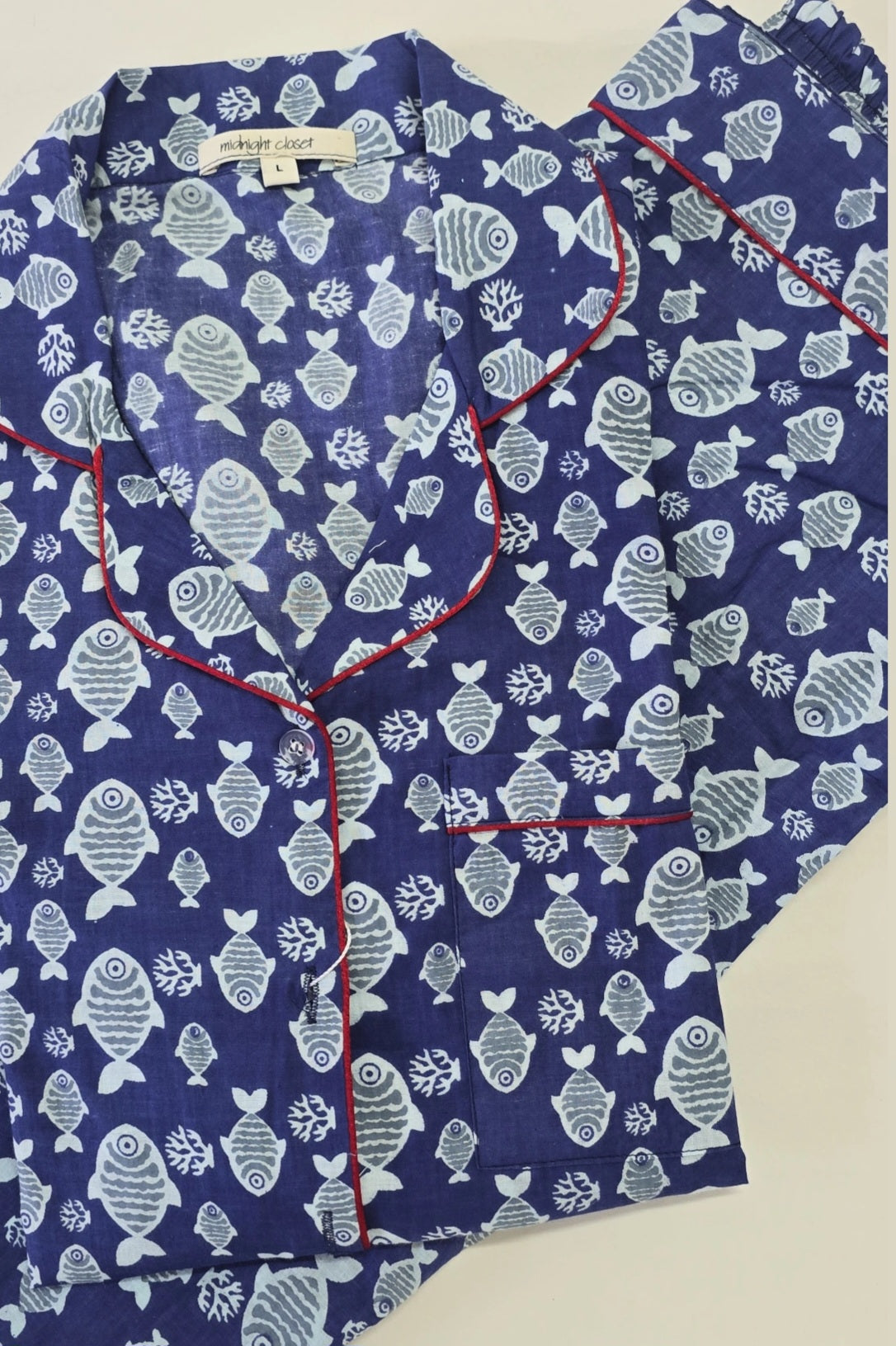 Dive into comfort with our all things fishy Pajama Set, featuring playful fish prints on a deep-sea blue base, finished with bold red piping for that perfect pop.