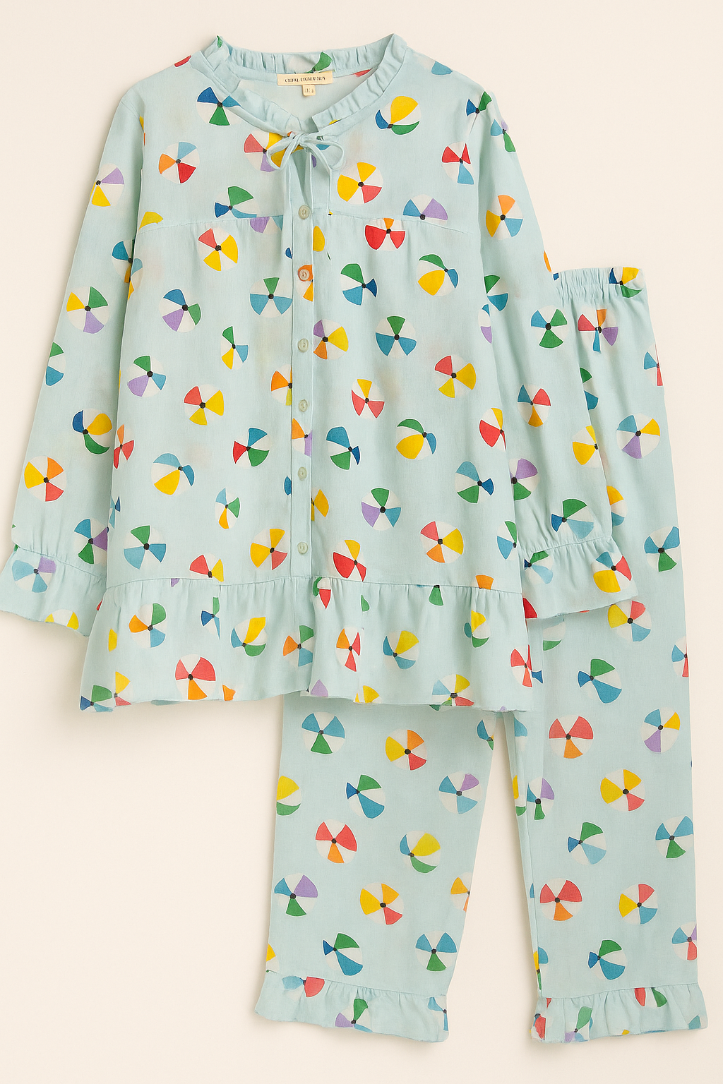 Adorned with cheerful, candy-colored swirl prints and finished with playful frill detailing, this cozy two-piece set brings a touch of fun to your bedtime routine. Perfect for lounging in comfort and style.