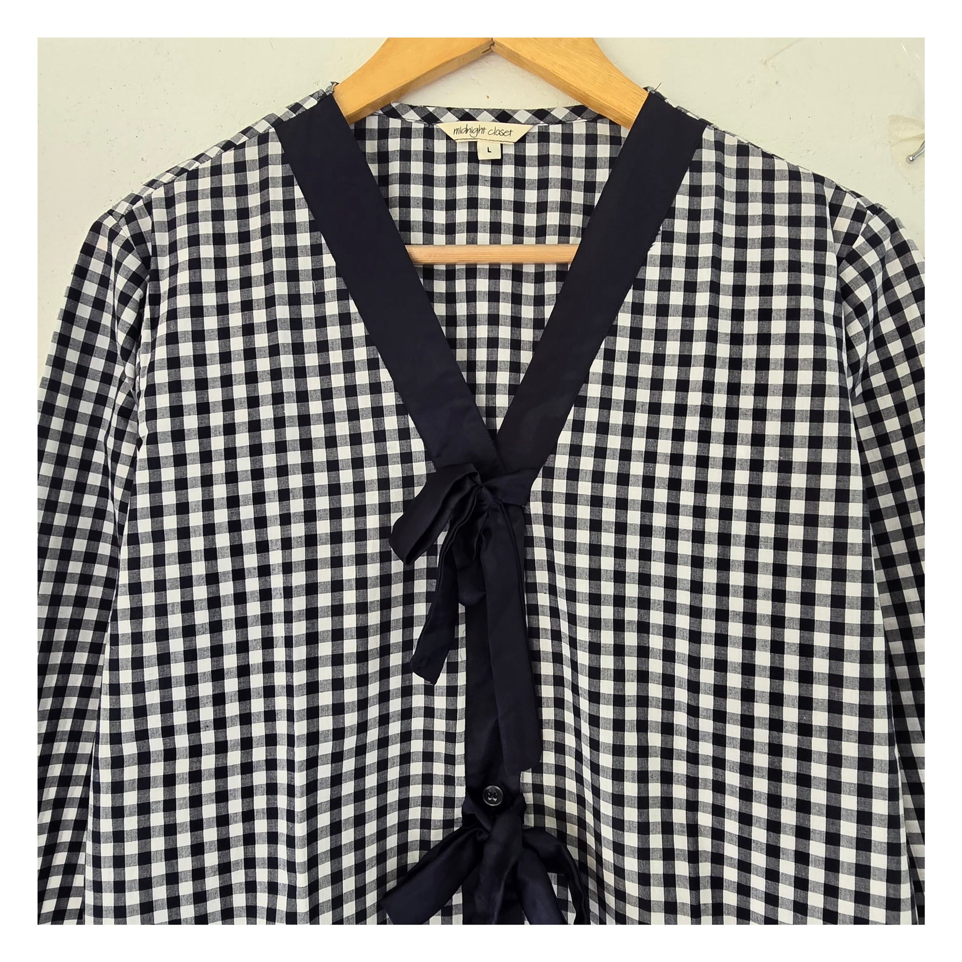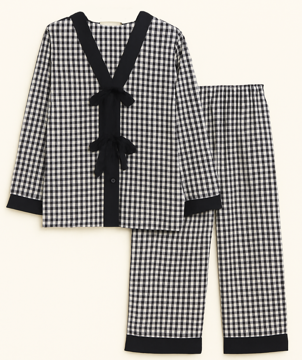Snuggle up in chekcmate bow — a pure cotton pajama set kissed with midnight satin details and tied up in charm.