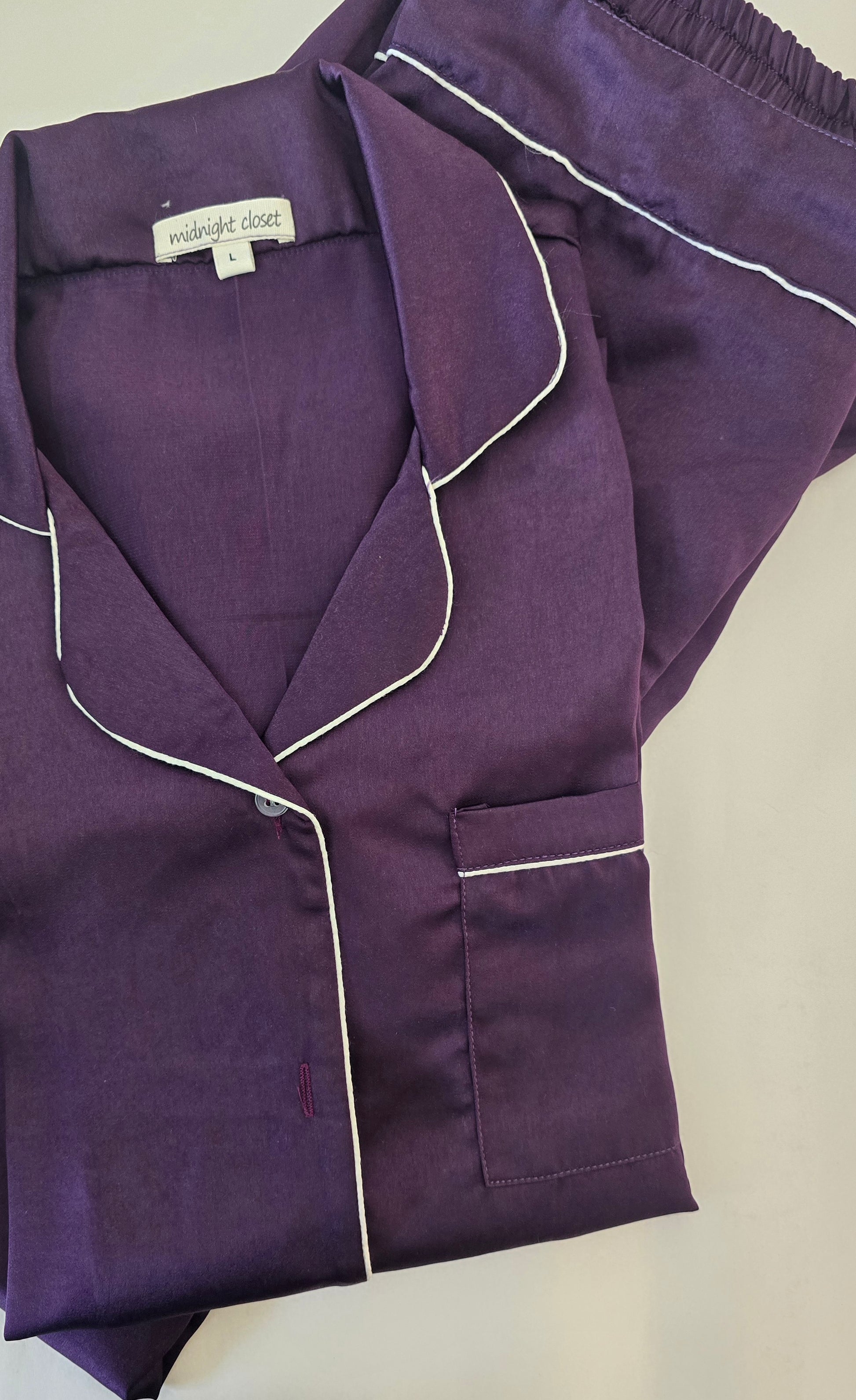 A deep plum satin essential pj set with contrast piping — polished, sophisticated, and made for luxurious lounging.