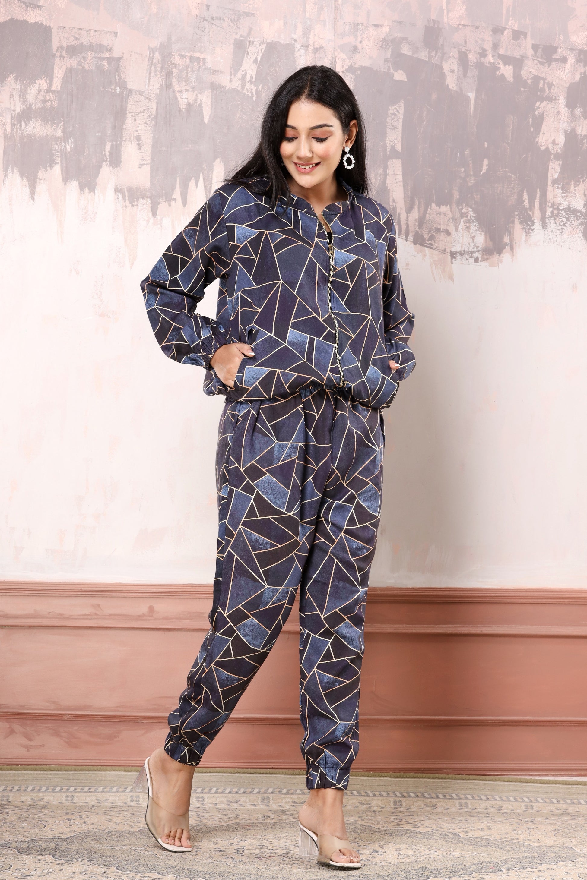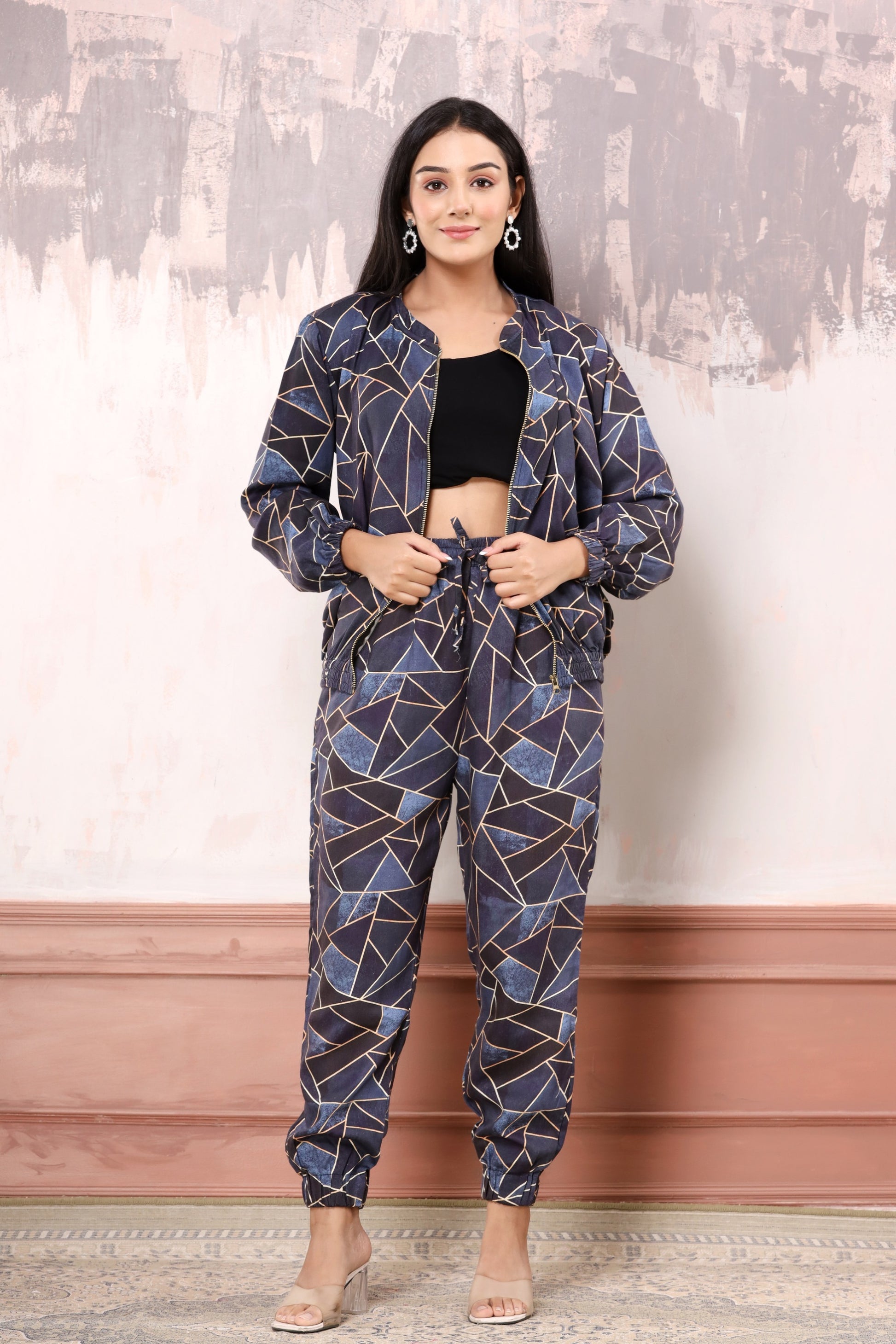 This bomber set has two pockets and a front zip. Jogger has 2 pockets, an elasticated waist and ankle.