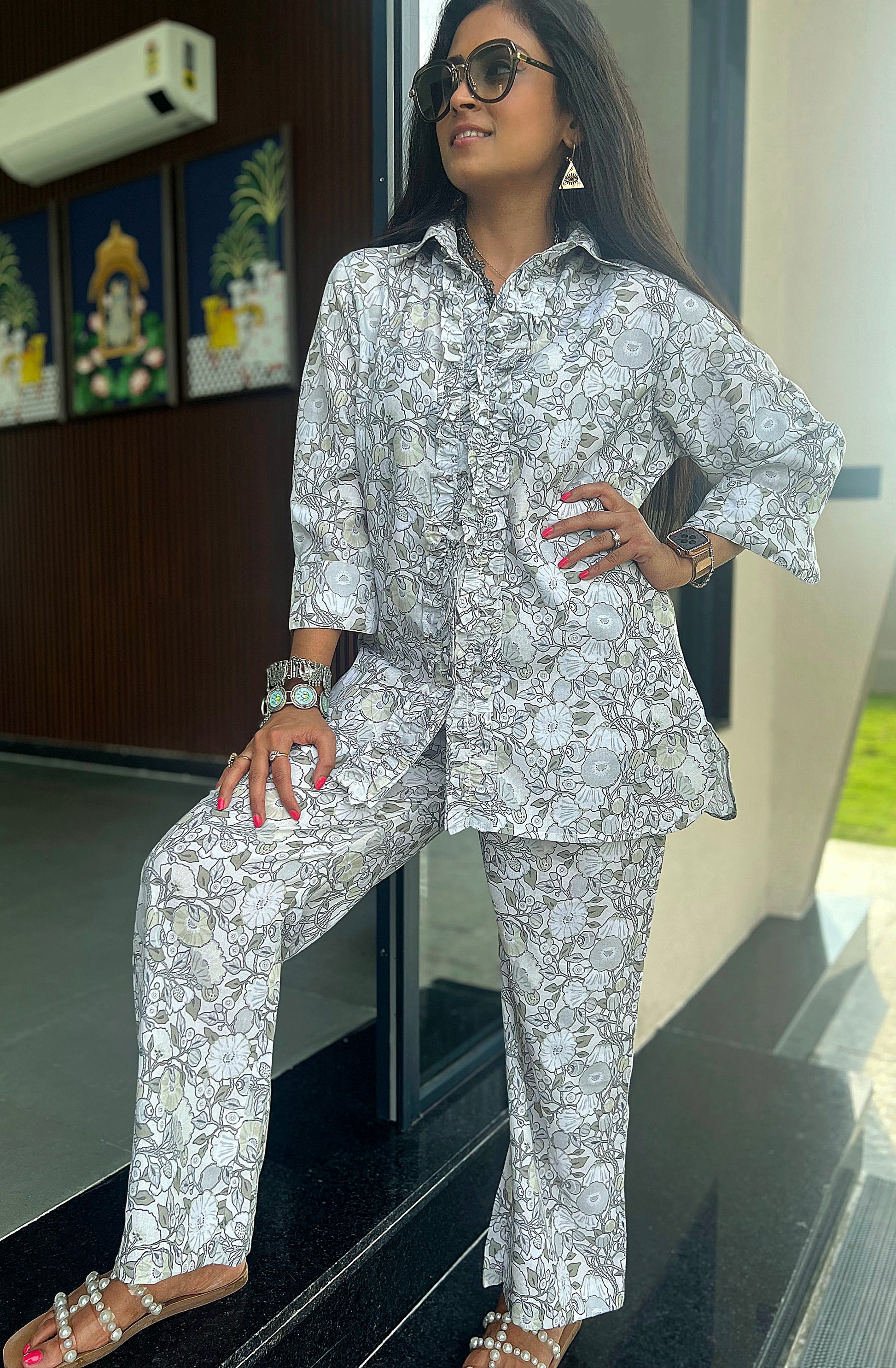 Fresh and summary feather light linen co-ord set with frilled detailing in front for a classy day look!