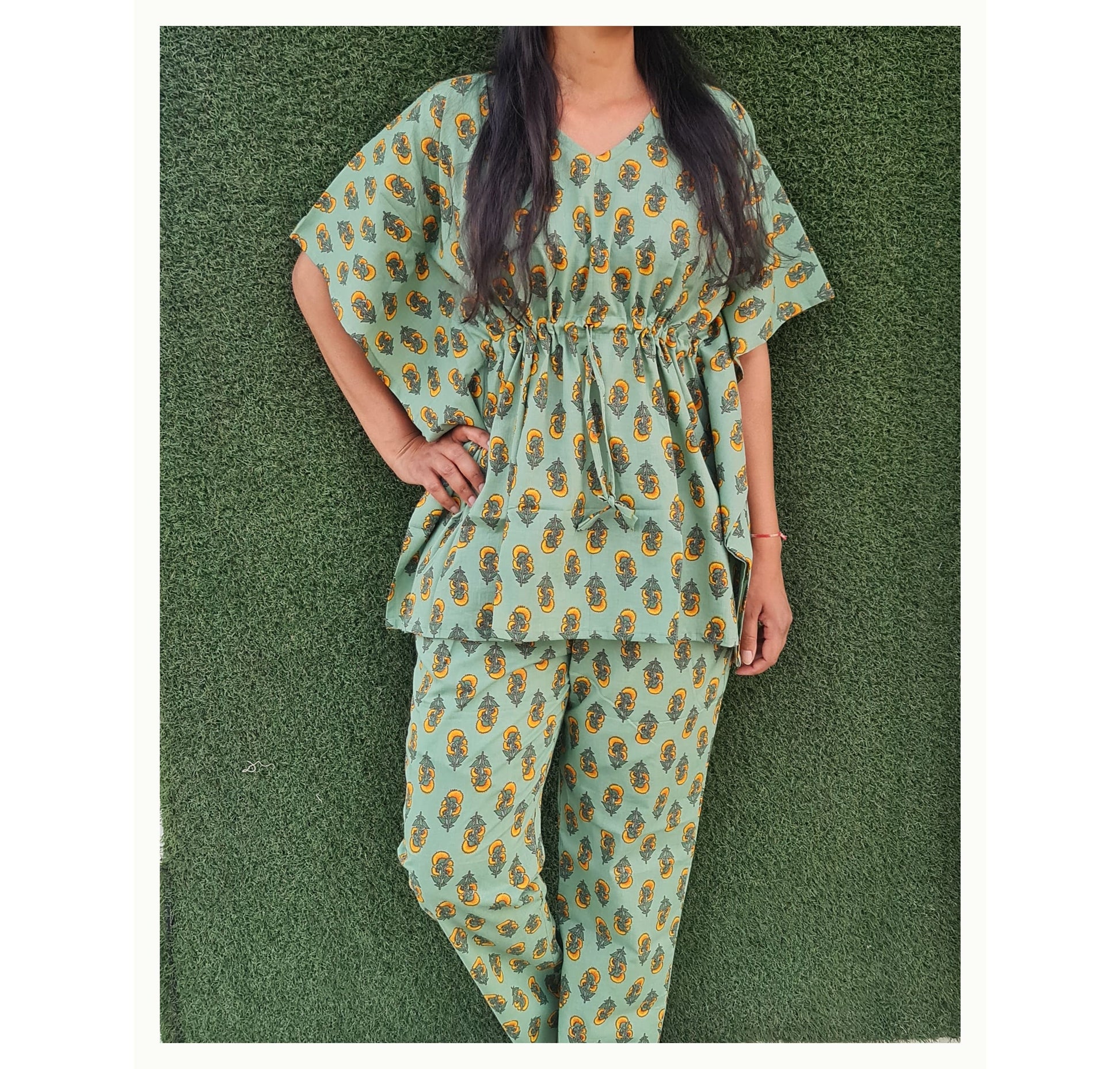 Easy breezy and comfortable kaftan with pajama for all day lounging.