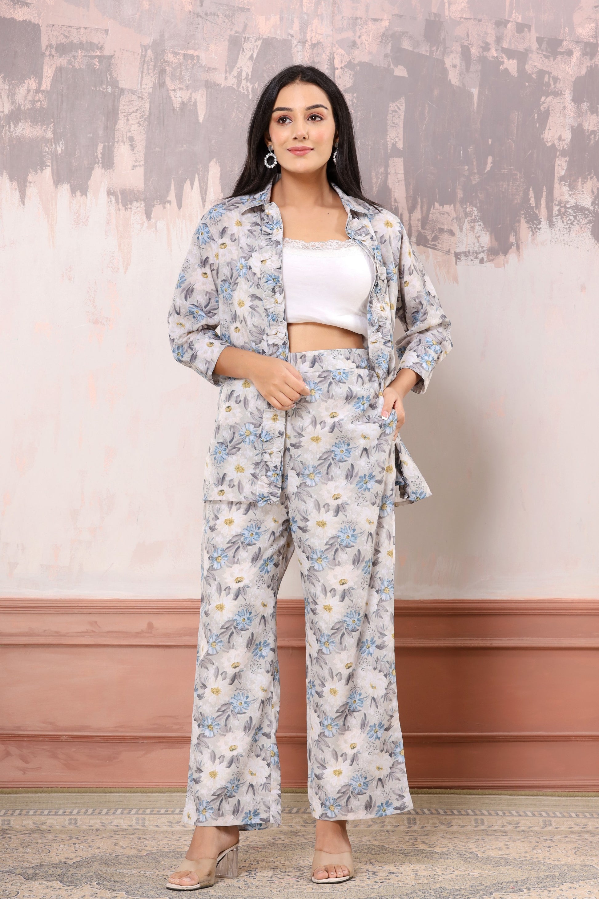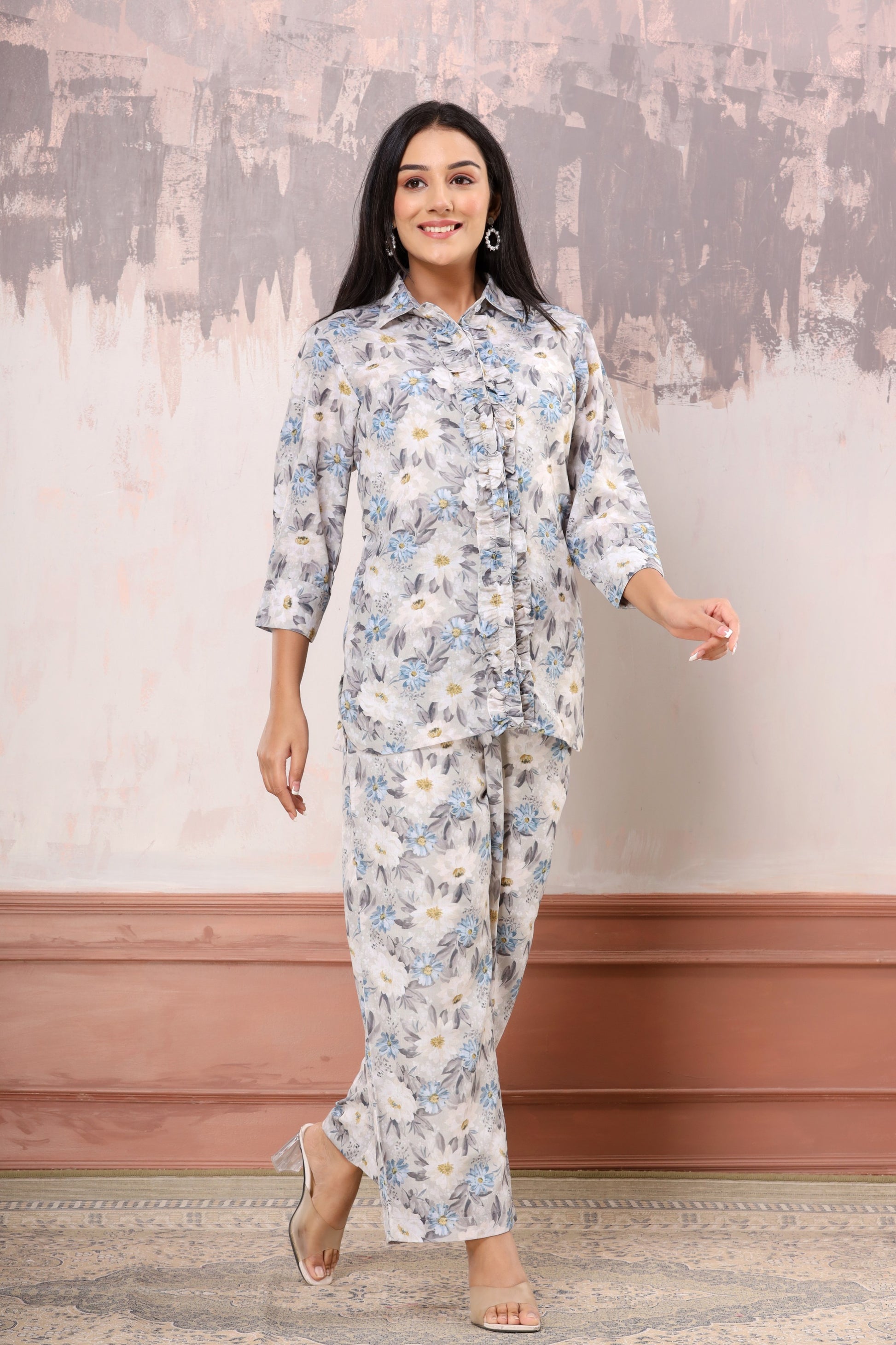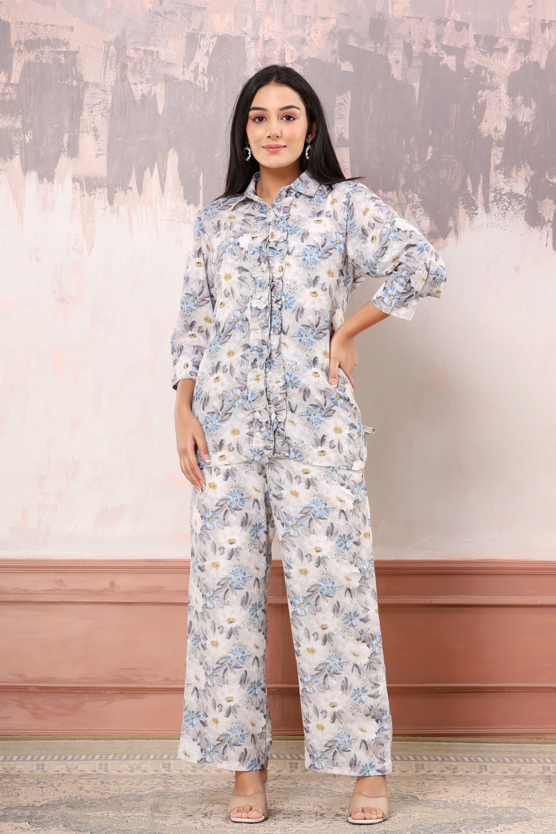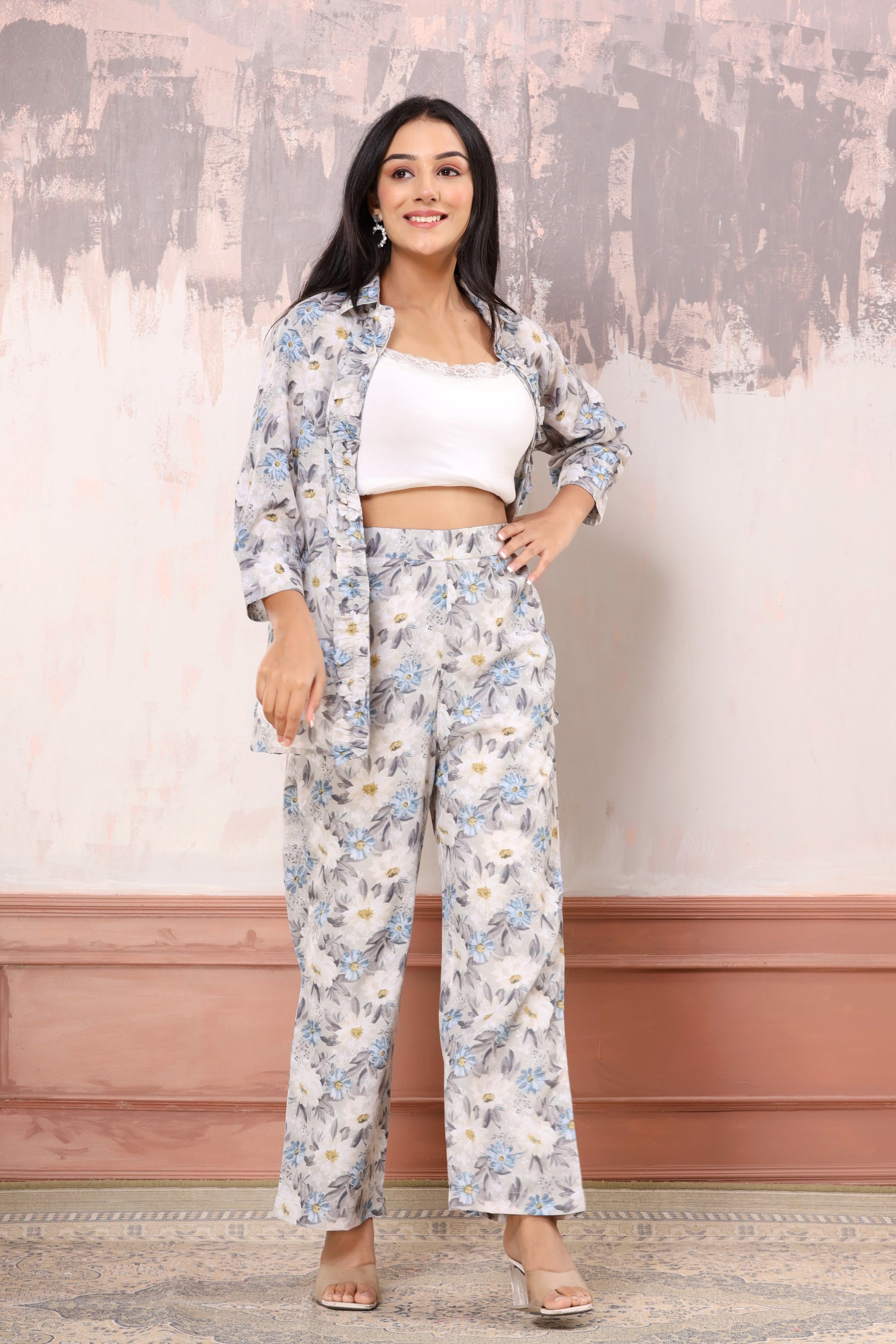 Fresh and summary feather light linen co-ord set with frilled detailing in front for a classy day look!