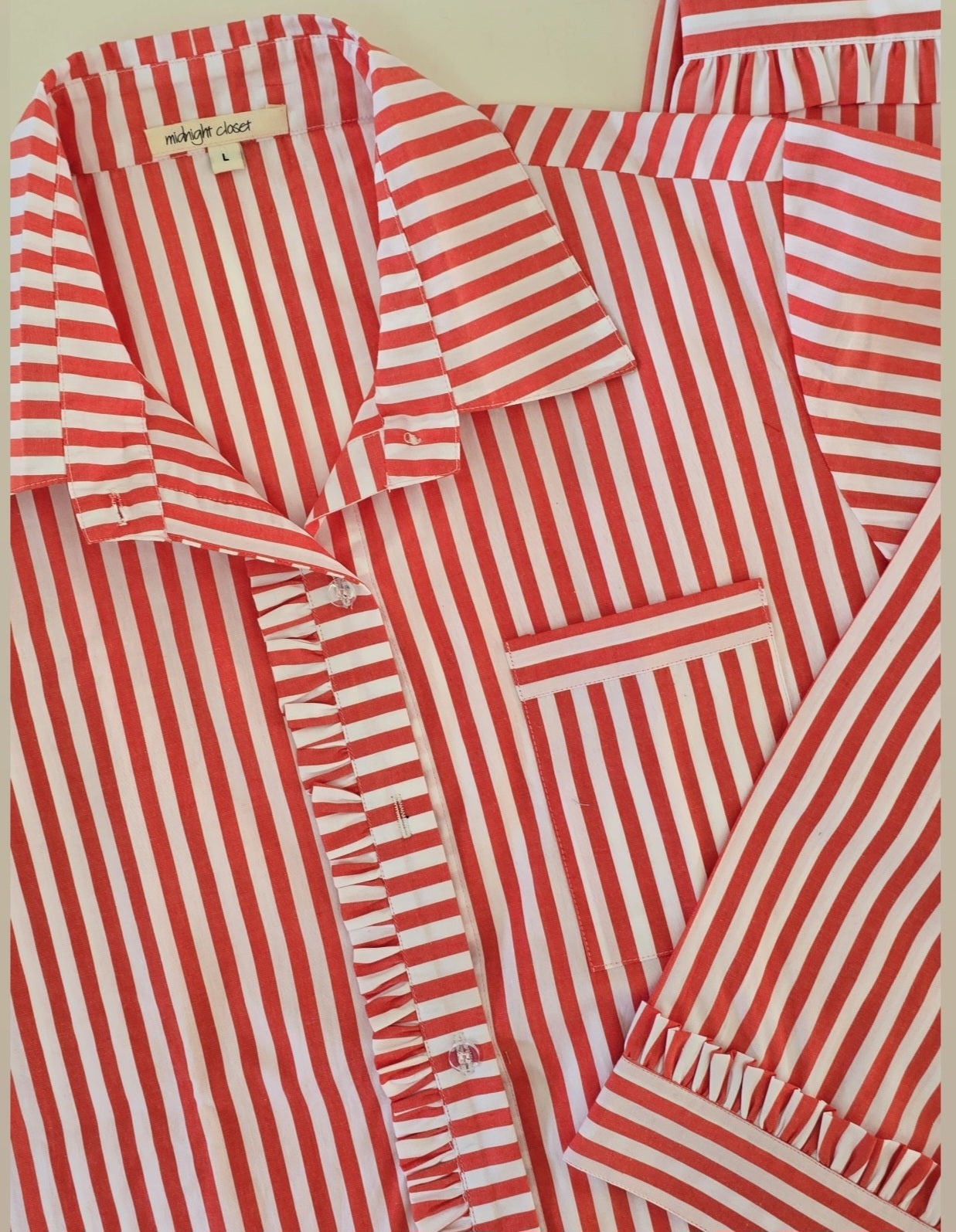 This pajama set comes with the classic style collar (not the lapeled one) and ruffles on one side. pajamas are elasticated with pockets on both side.