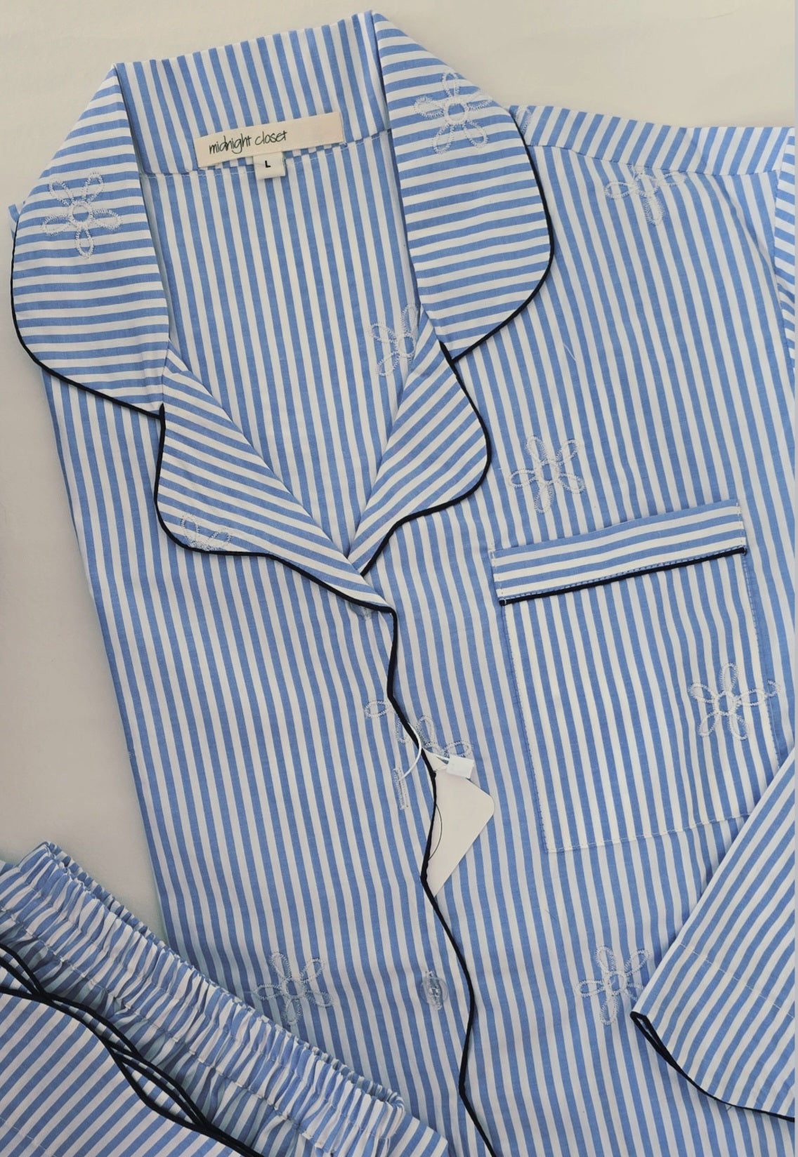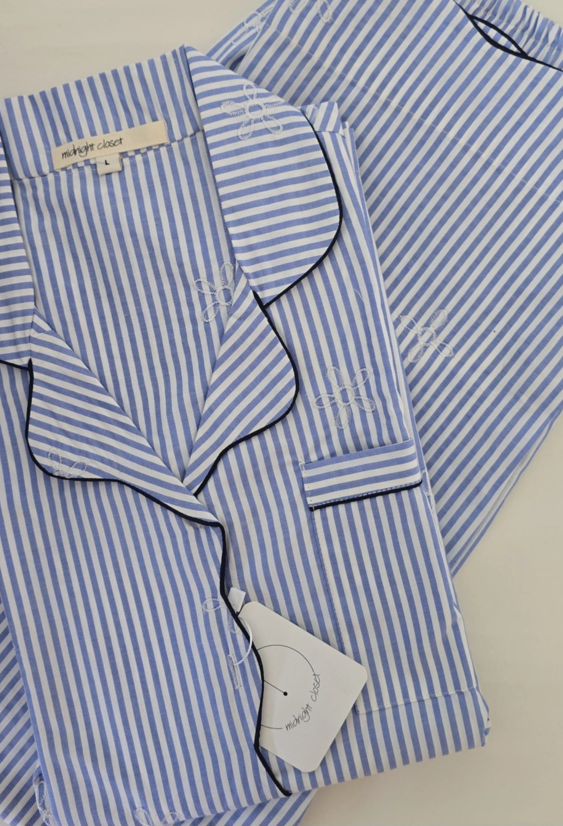 Drift into comfort with our new serenity pj set — a timeless striped pajama set kissed with subtle embroidery and paired with scalloped design.