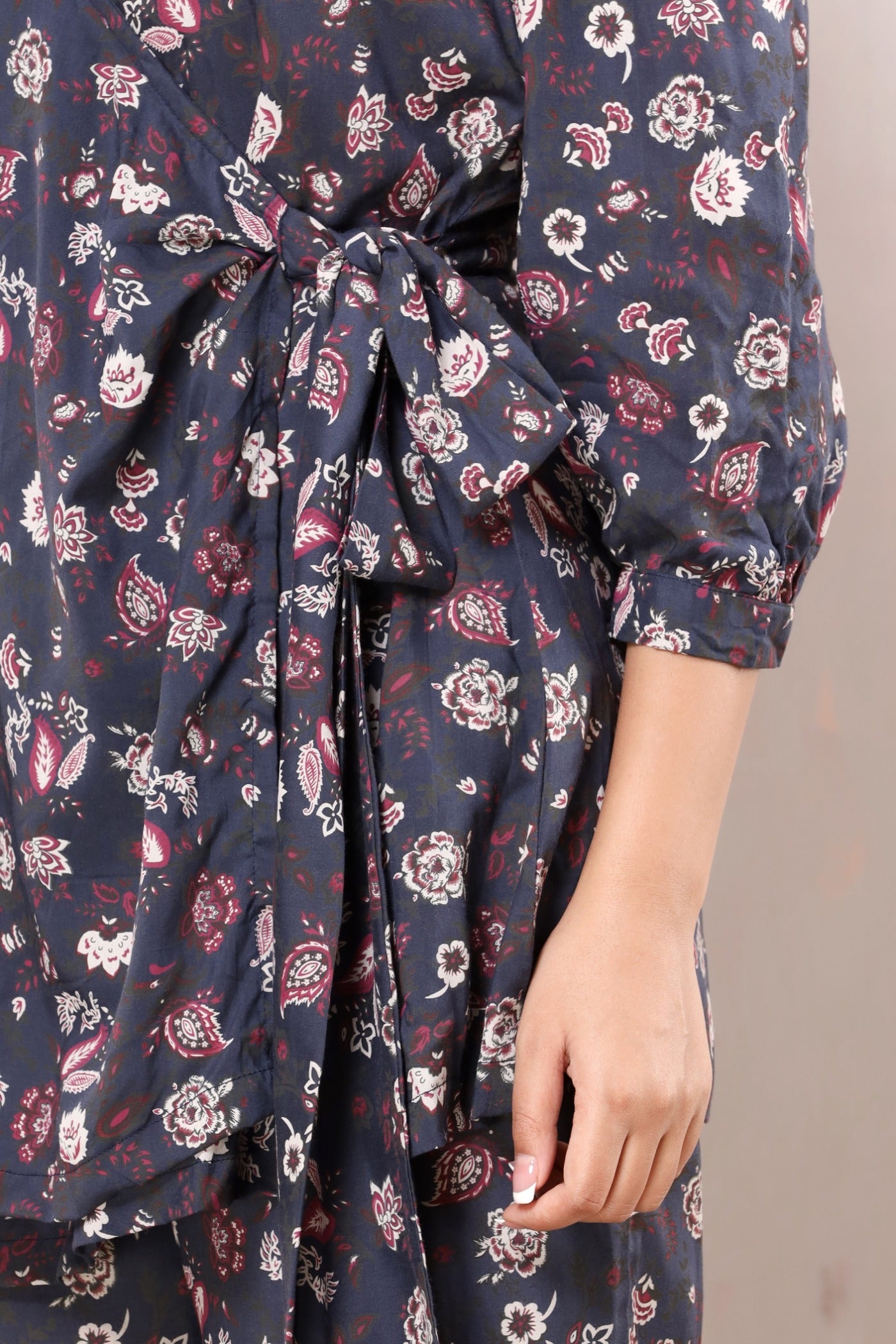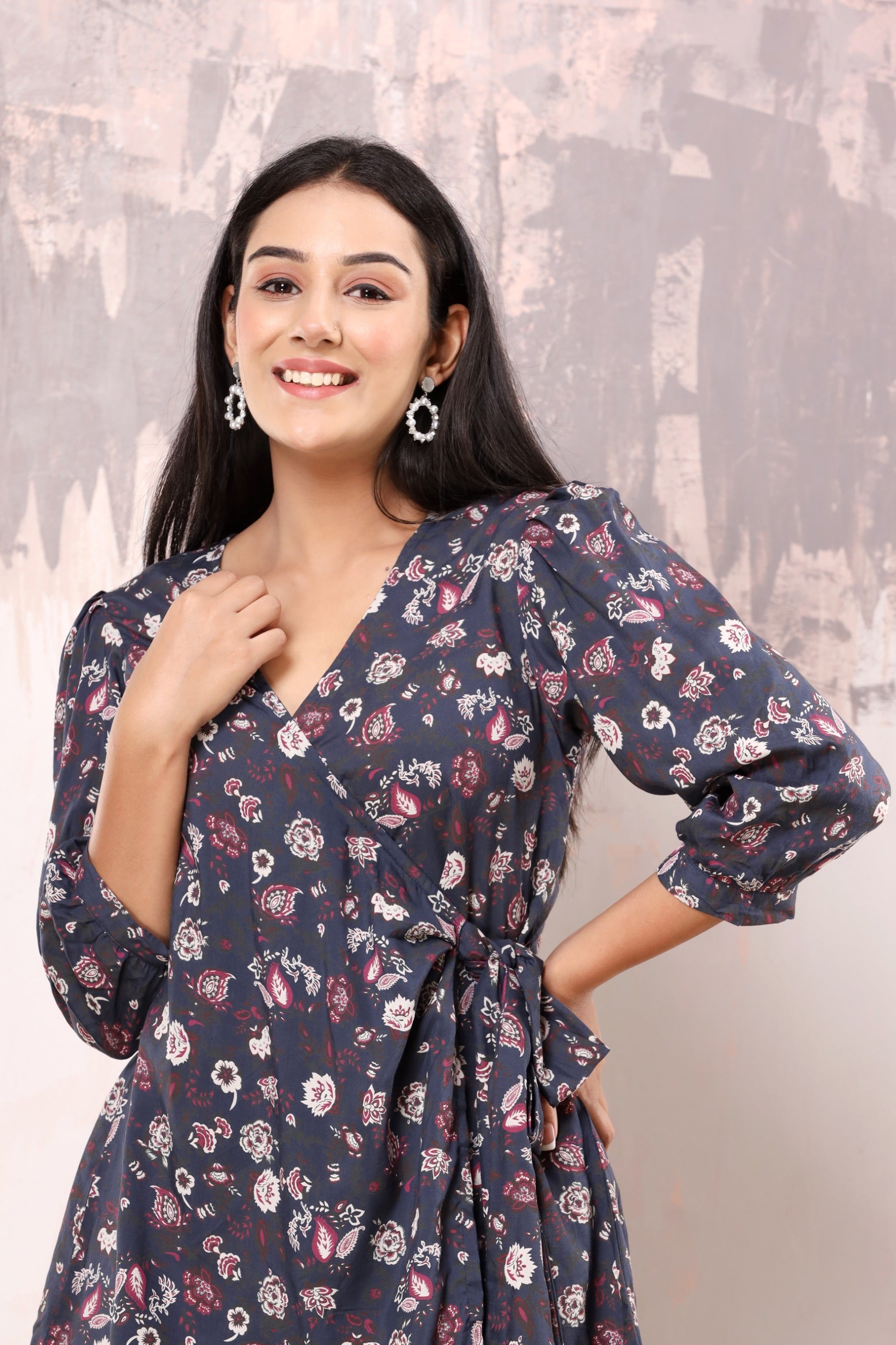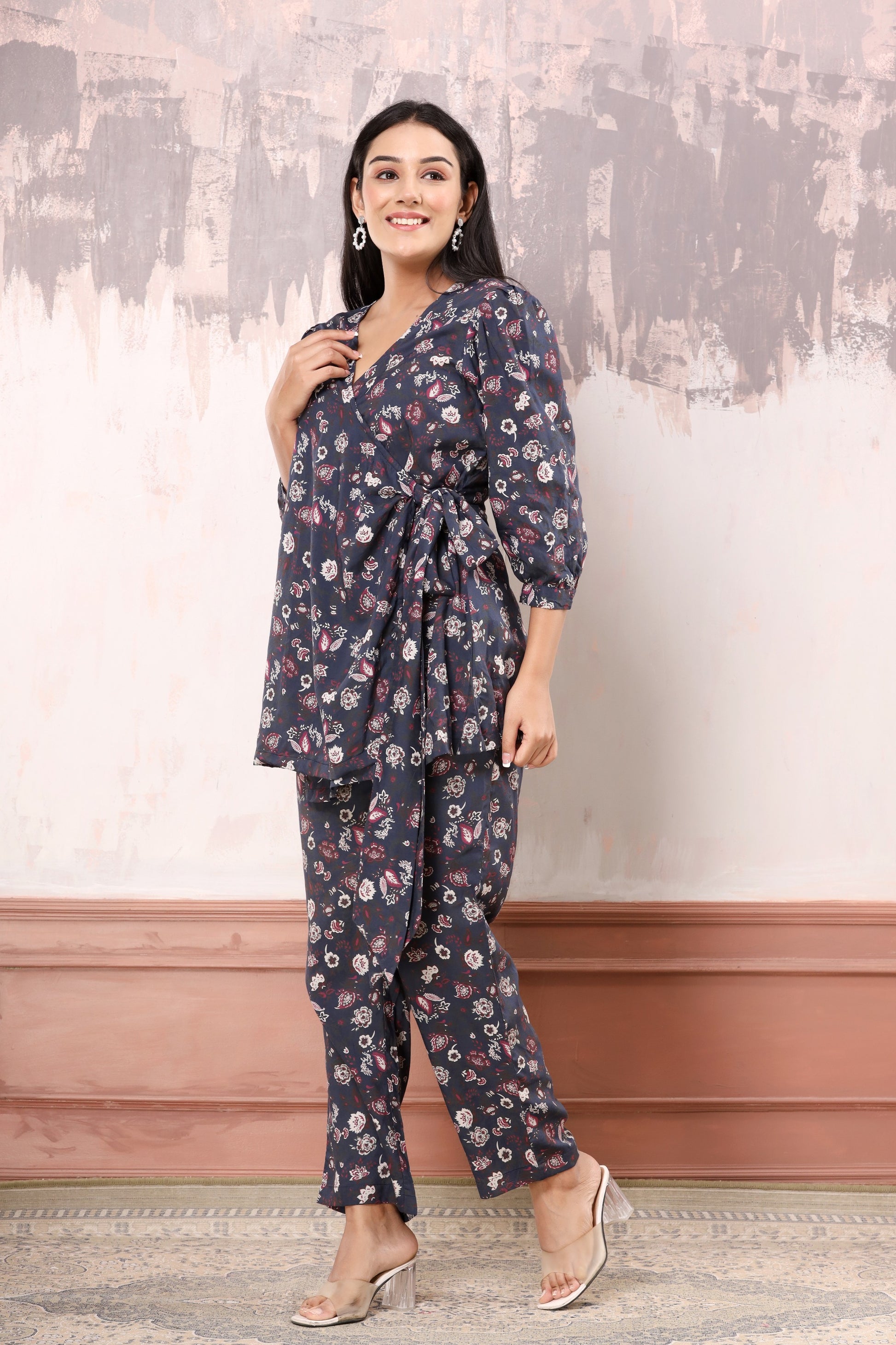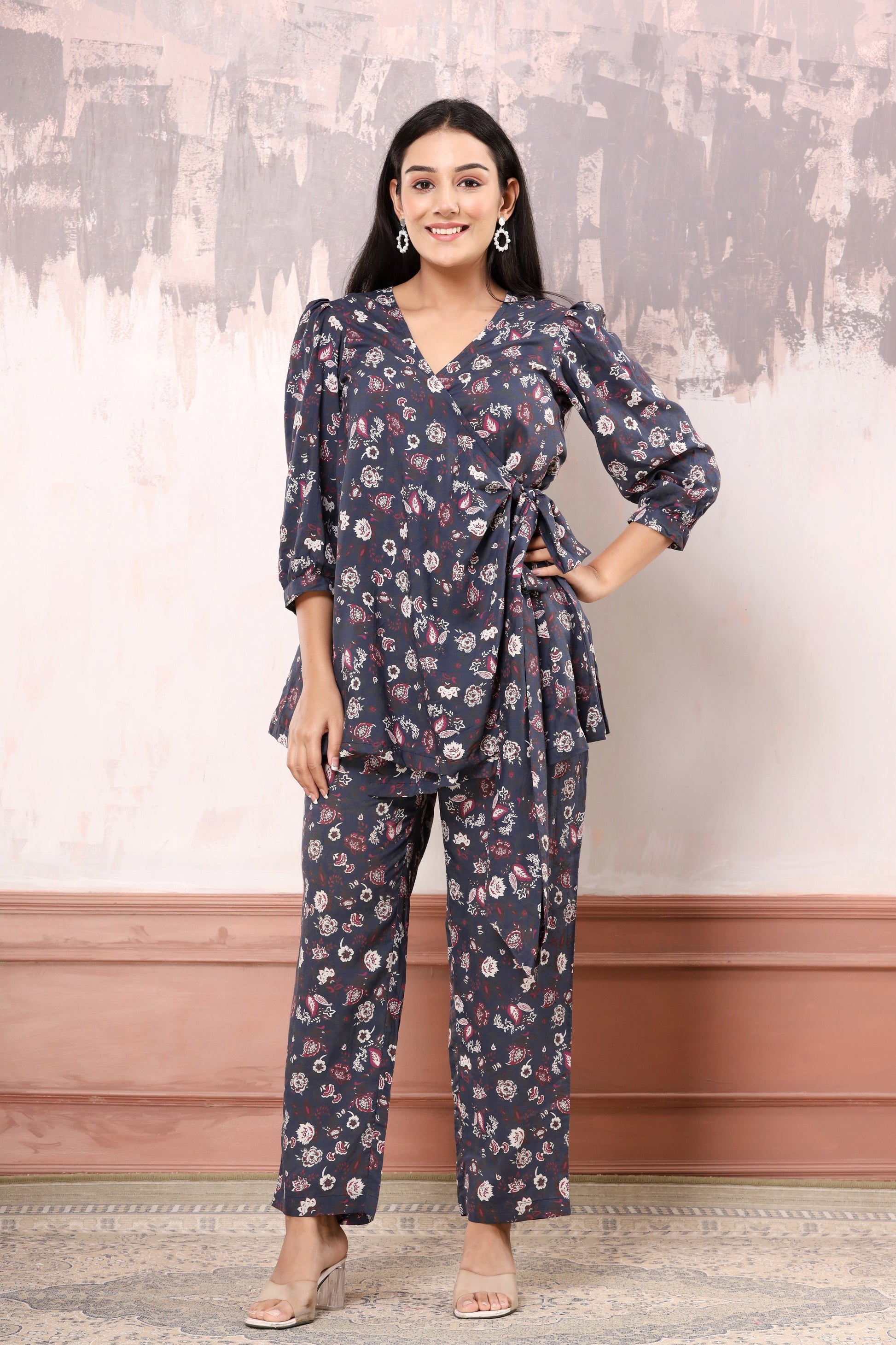 Wrap around top with puffed sleeve, and a long tie up on one side. straight fit pants with 2 pockets and elasticated back.