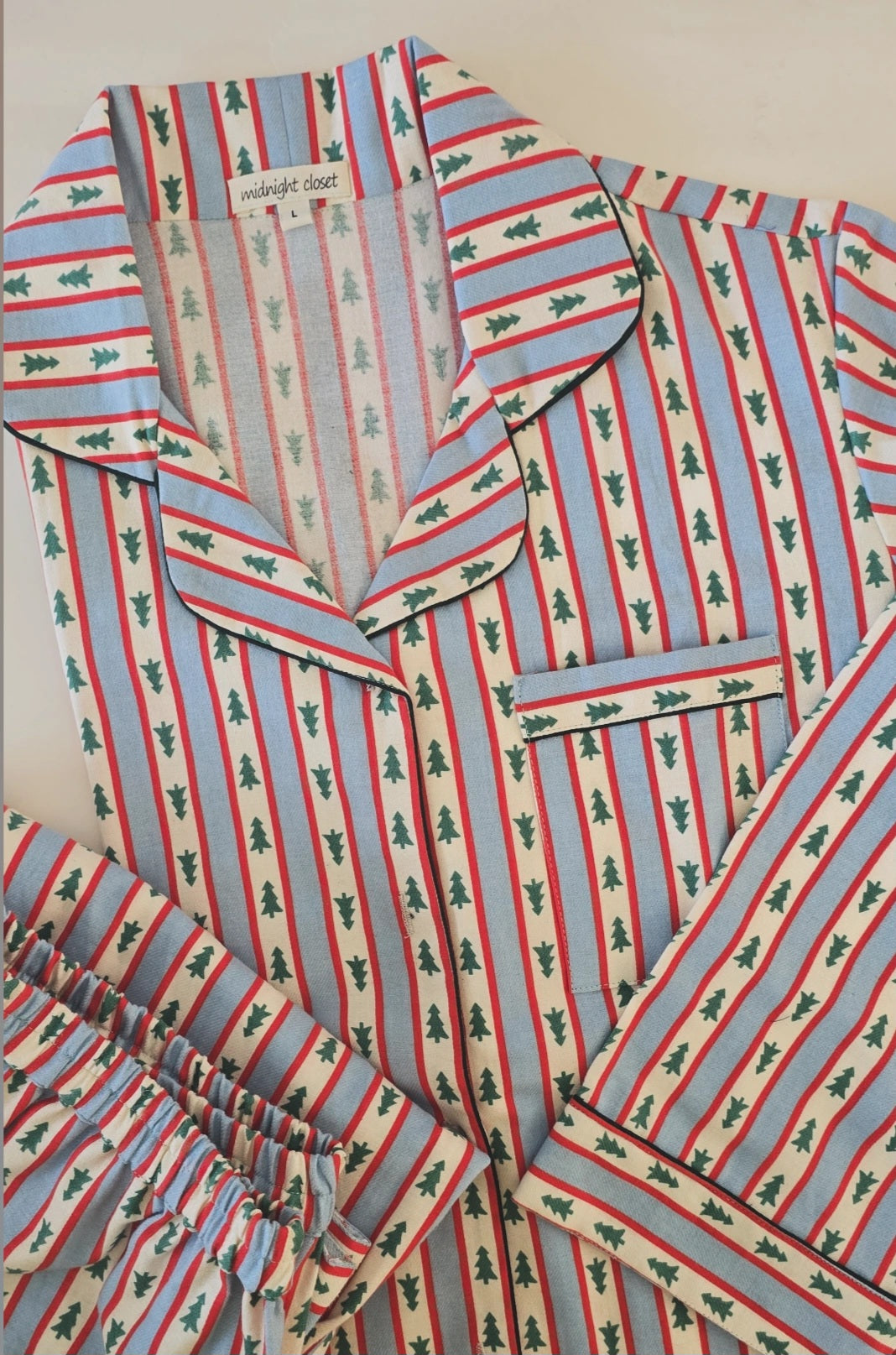 A soft flannel pajama set designed to keep you warm and snug. Featuring classic stripes with pine motifs, it’s perfect for chilly nights, winter lounging, and festive evenings at home