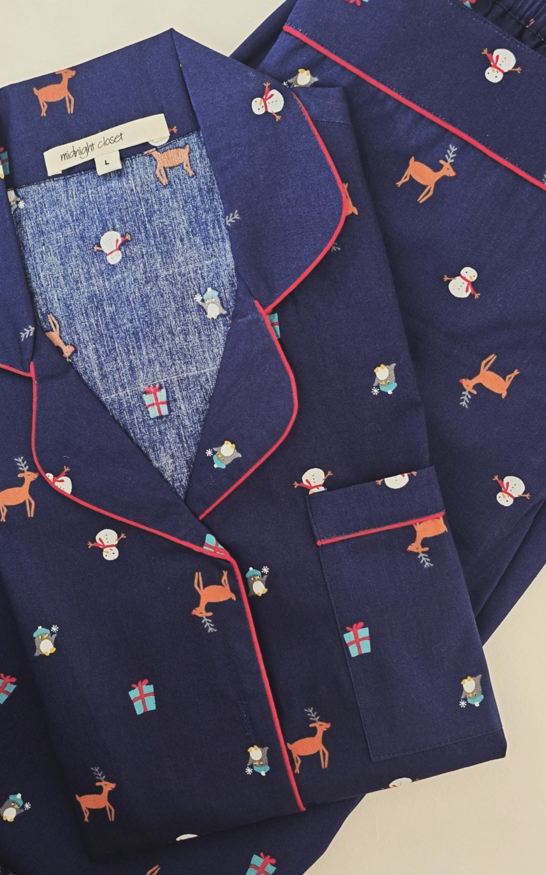 Wrap yourself in cozy festive vibes with our Winter Joy PJ Set — a navy cotton ensemble sprinkled with playful reindeers, snowmen, and gifts.